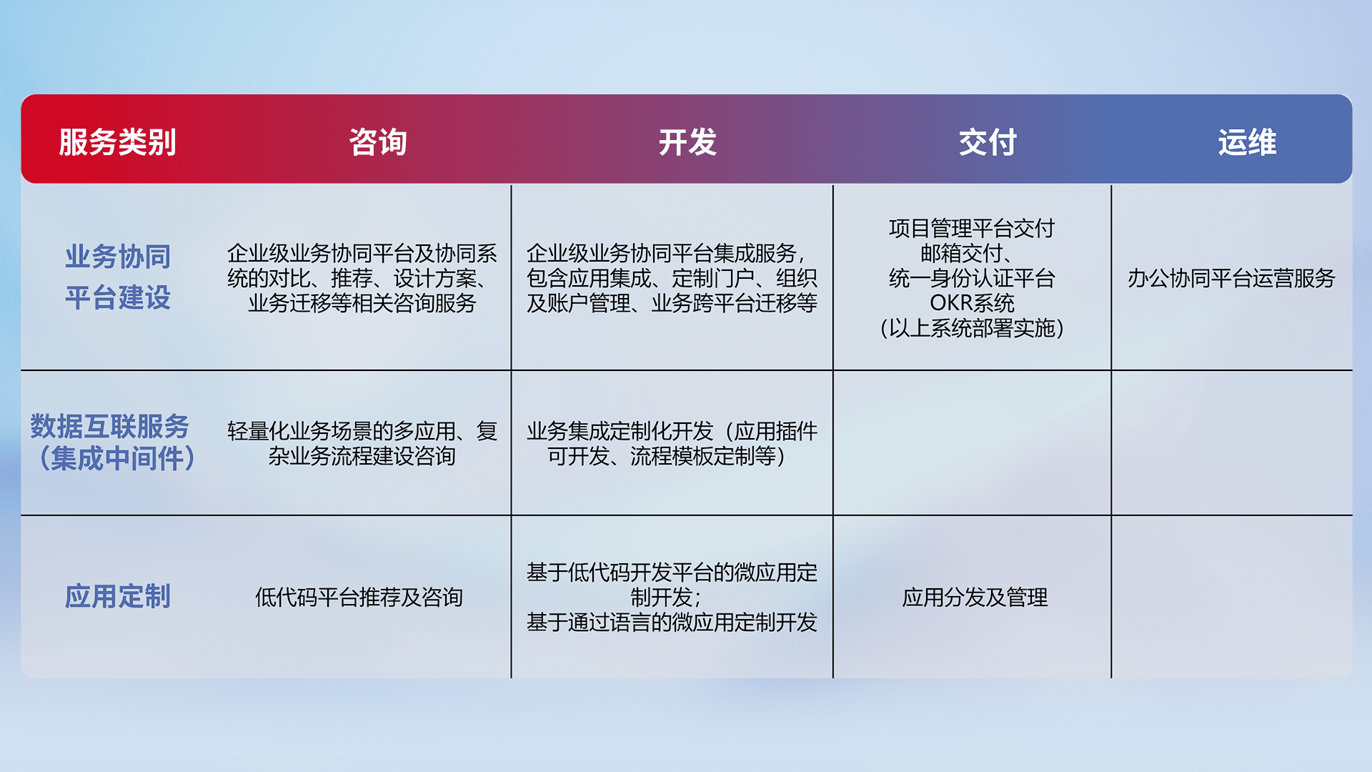针对钉钉、、、企微、、、IDaas等平台级产品提供产品的规划、、、方案、、、交付、、、定制化开发等服务,,,,实现如统一协同办公、、智能客户服务、、、混合会议管理、、、、智能数据查询、、等业务场景,,实现数字化转型。。。